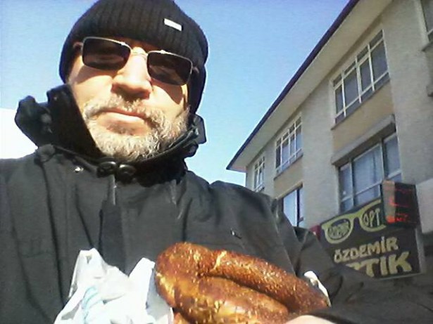 Sırt üstü yere uzanmış vatandaşın bir iki metre ilerisinde bir tablanın üzerinde simitler vardı. Yanında da iki ayaklı sehpası duruyordu.